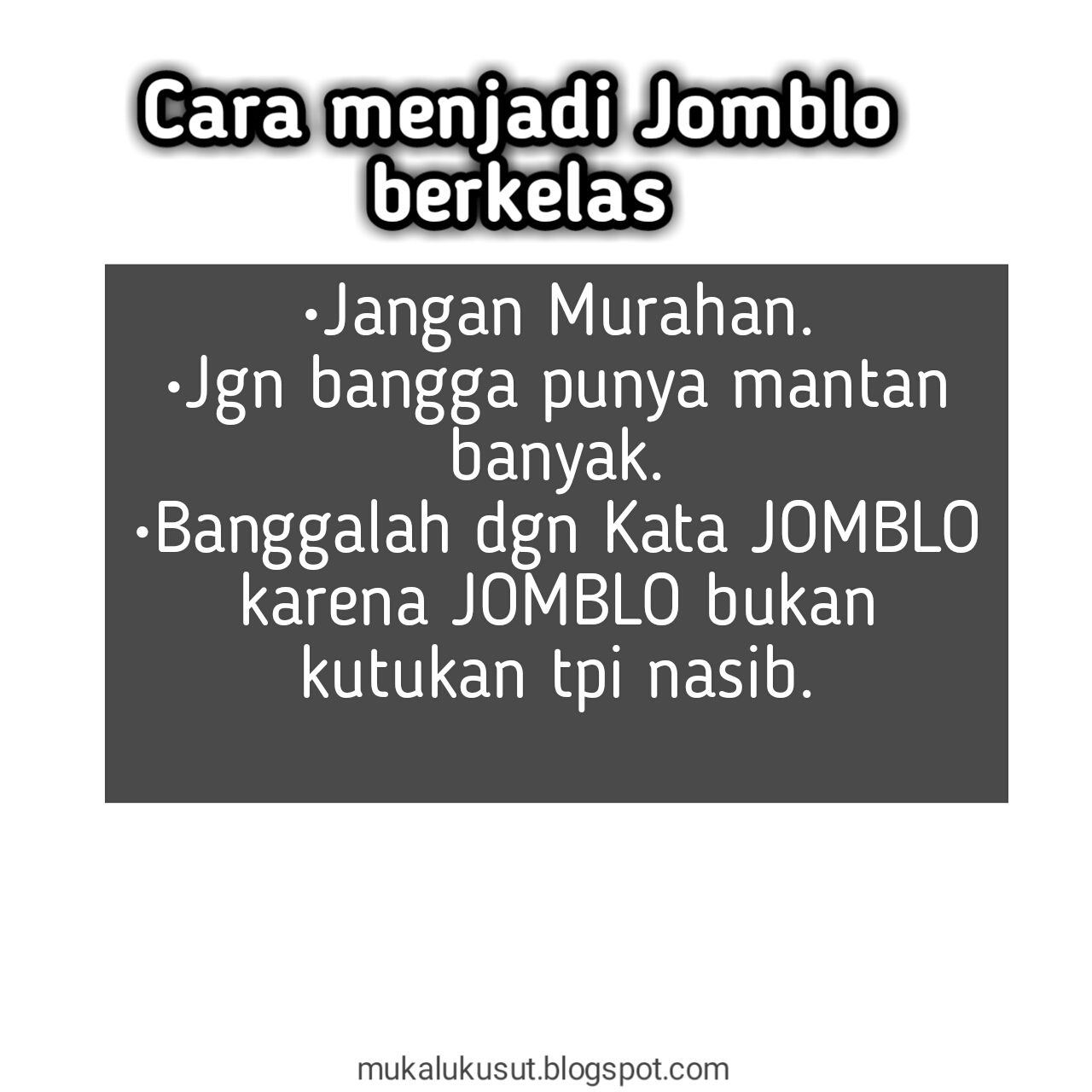 Kamu bisa membuktikan bahwa jomblo tak selamanya menderita. Jomblo itu bukannya nggak laku jomblo itu sangat mahal harganya. Apakah kamu ada diposisi itu. Kata jomblo berkelas jomblo merupakan masanya anak muda yang mendahulukan pengembangan karier dan masa depannya untuk bisa mendapatkan cinta yang lebih berkelas nantinya begitu tuhan menjadikan manusia jomblo pada saat ini karena dia tidak ingin melihat manusia tersebut hanya menghabiskan waktu bersama orang yang tidak tepat.