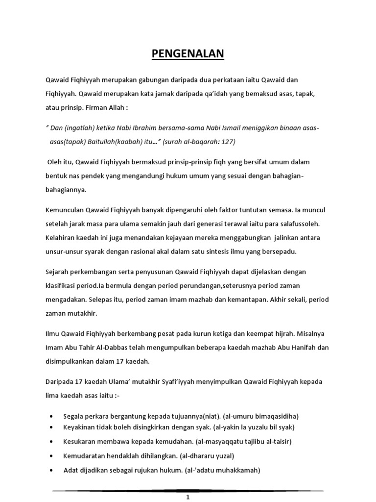 Pemahaman akan qawaid fiqhiyah dengan menguasai kaidah kaidah fiqh kita akan mengetahui benang merah yang menguasai fiqh karena kaidah fiqh itu menjadi titik temu dari masalah masalah fiqh dan lebih arif di dalam menerapkan fiqh dalam waktu dan tempat yang berbeda untuk kasus adat kebiasaan keadaan yang berlainan. Ahmad warson menembahkan bahwa kaidah bisa berarti al asas dasar atau pondasi al qanun peraturan dan kaidah dasar al mabda prinsip dan al nasaq metode atau cara. Pengertian qawaid fiqhiyah qawaid merupakan bentuk jamak dari qaidah yang kemudian dalam bahasa indonesia disebut dengan istilah kaidah yang berarti aturan atau patokan. Academia edu is a platform for academics to share research papers.