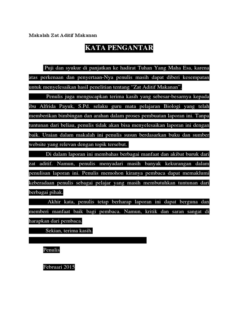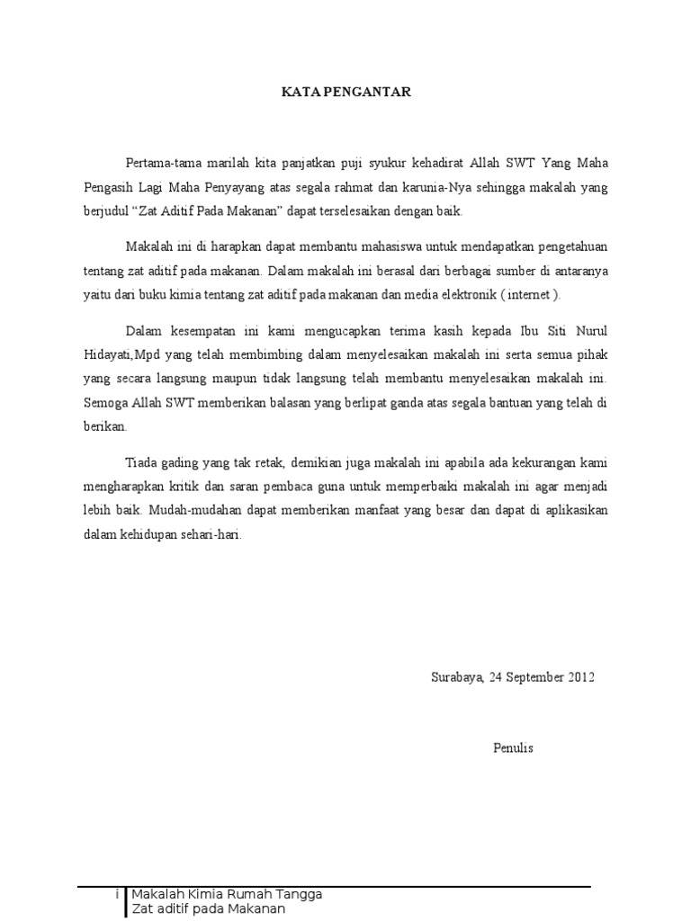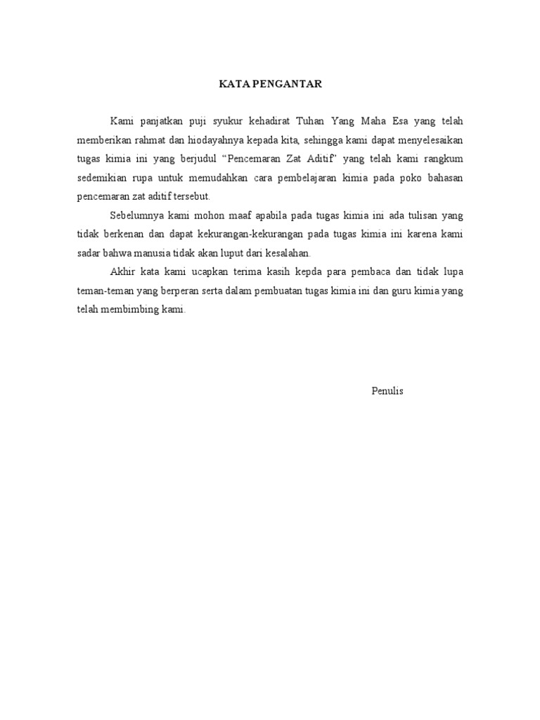 Kata pengantar zat aditif. Kata pengentar ini biasanya berada di halaman depan di dalam cara membuat karya tulis ilmiah. Makalah zat aditif 1. Kata pengantar kami panjatkan puji syukur kehadirat tuhan yang maha esa yang telah memberikan rahmat dan hidayahnya kepada kita. Kata pengantar kami panjatkan puji syukur kehadirat tuhan yang maha esa yang telah memberikan rahmat dan hidayahnya kepada kita sehingga kami dapat menyelesaikan tugas kimia ini yang berjudul pencemaran zat aditif yang telah kami rangkum sedemikian rupa untuk memudahkan cara pembelajaran kimia pada pokok bahasan pencemaran zat aditif tersebut.