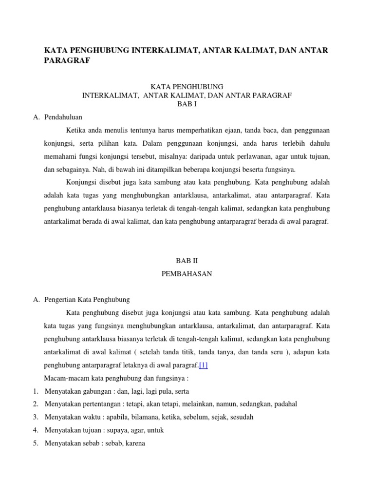 Kata penghubung antar paragraf. Konjungsi berisi kata kata tugas yang memiliki fungsi untuk menghubungkan antara klausa kalimat atau paragraf. Contoh konjungsi antar paragraf konjungsi adalah kata penghubung atau kata sambung. Dengan adanya kata penghubung ini kalimat menjadi lebih padu. Melengkapi bahasan kita sebelumnya tentang jenis jenis kata penghubung intrakalimat maka dalam artikel kali ini kita akan membahas tentang jenis jenis kata penghubung antarkalimat lengkap dengan contohnya.
