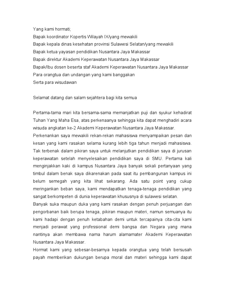 Kata sambutan ini disampaikan mewakili teman teman seangkatan wisuda pada acara. Sambutan perwakilan orang tua wisudawan ti wisuda periode 100 padang 07 juni 2014 assalamualaikum warrahmatullahi wabarokatuh. Wisudawan akademi farmasi pemerintah aceh banda aceh. Terima kasih karena telah memberikan kesempatan kepada kami untuk memberikan kata sambutan disini sebagai perwakilan wali siswa.