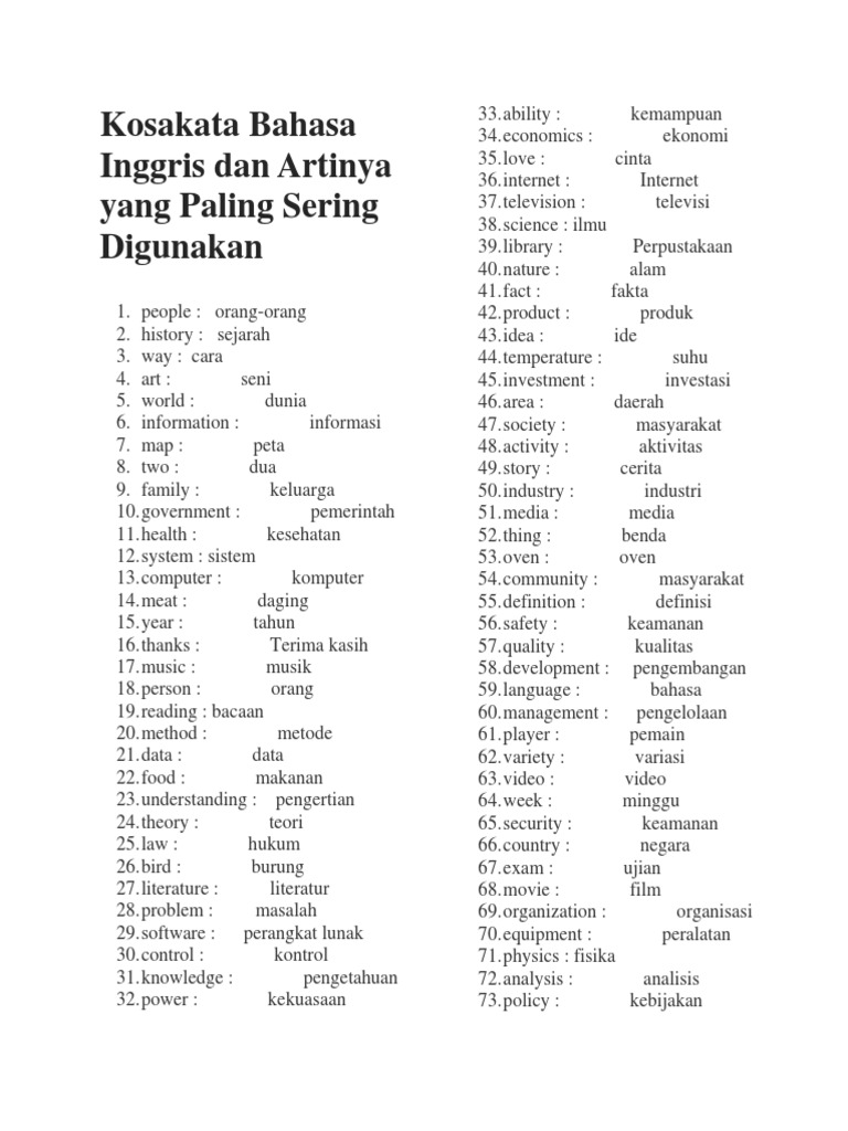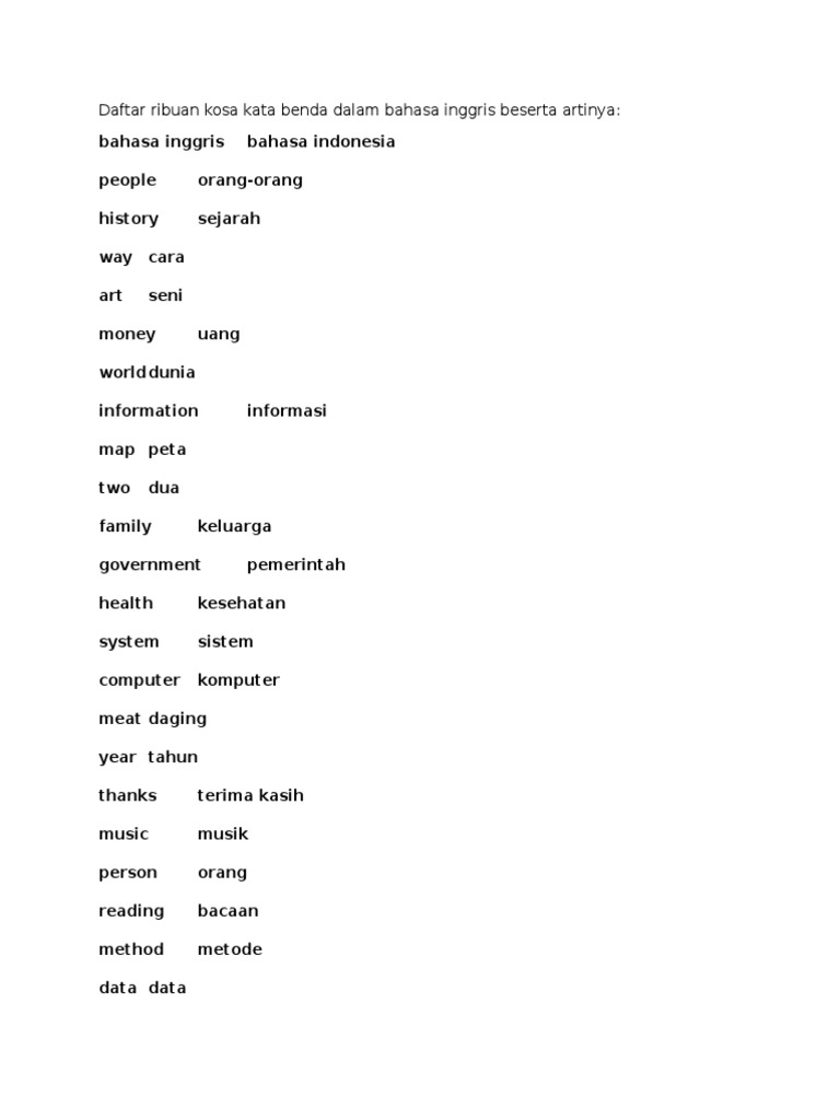 Dalam belajar bahasa inggris memahami dan menghapal kosakata kata kerja sangat penting karena kata kata kerja. Berikut adalah daftar kata benda nouns dalam bahasa inggris dan artinya dalam bahasa indonesia.